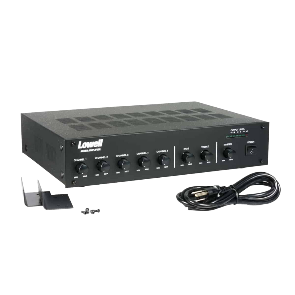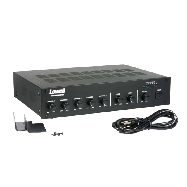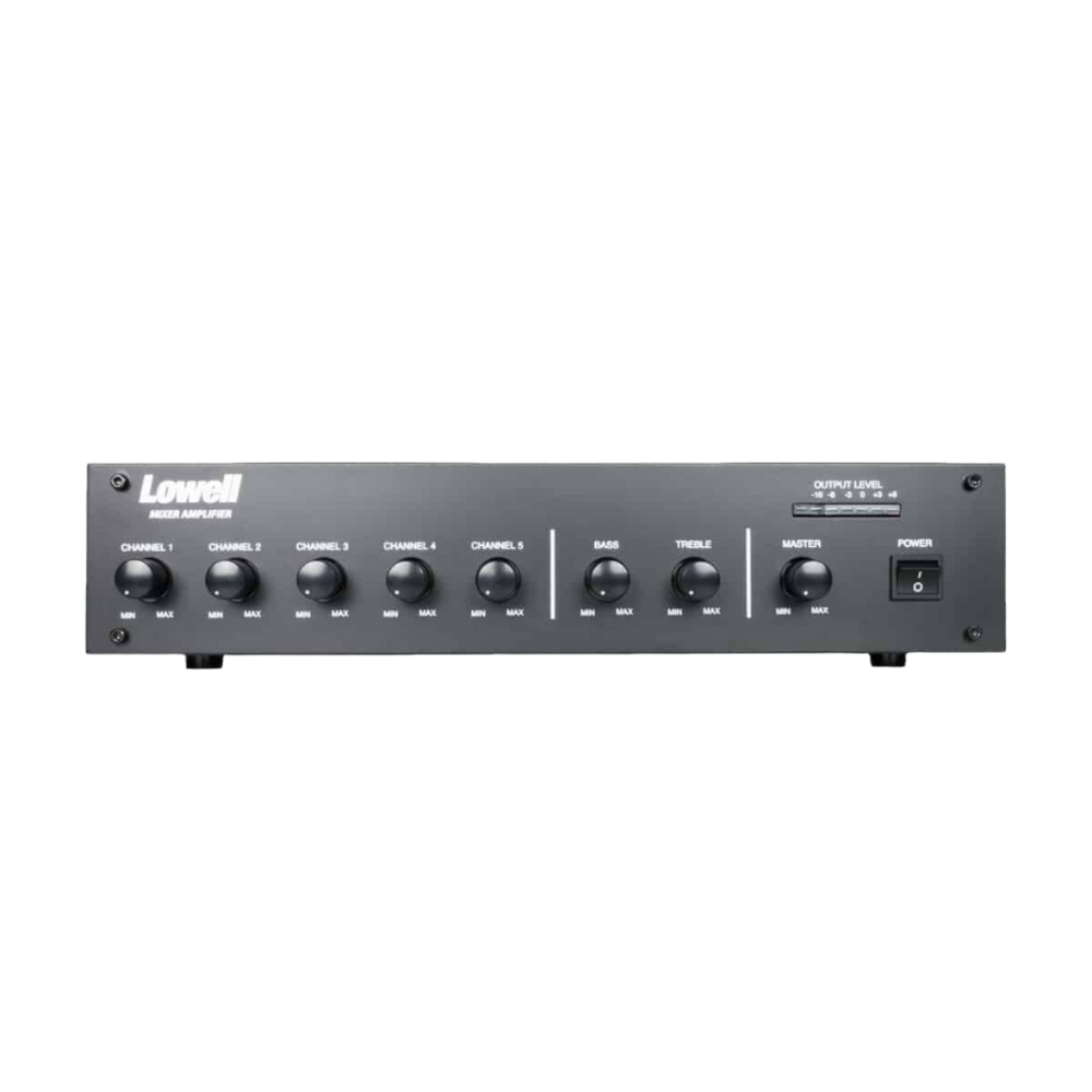 Mixer with 60W amplifier is powered via switchable 115 or 230 VAC @50/60Hz or 24VDC. It features five channel volume controls, treble and bass controls, master volume control, main power switch, and LED display bank for output level.