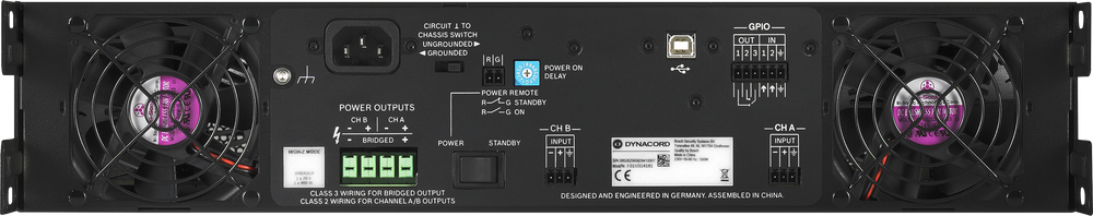 Dynacord C Series amplifiers are dedicated installation DSP amplifiers optimized for 24/7 operation. Integrated digital signal processing provides access to professional speaker processing with FIR Drive technology. C Series amplifier utilize Class A/B resp. Class H topologies, which provide market leading acoustic performance and reliability. The connectivity is optimized for the needs of fixed install applications. For low cost of ownership, a power saving standby mode is available. A front panel LC display allows local control and supervision of the amplifier. An intuitive system control software allows fast system setup, flexible system control and comprehensive supervision.