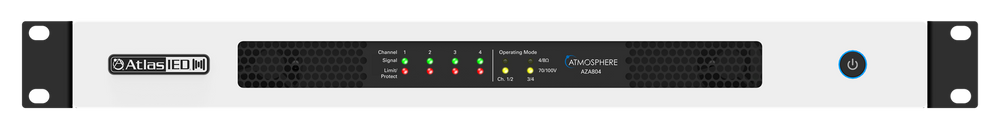 The AtlasIED Atmosphere AZA804 four-channel amplifier is designed to interface with the Atmosphere family of products, such as the AZM series of processors. The AZA amplifiers can be configured in pairs to deliver up to 100W per channel into both low and high impedance speaker loads (4Ω/8Ω/70V/100V).