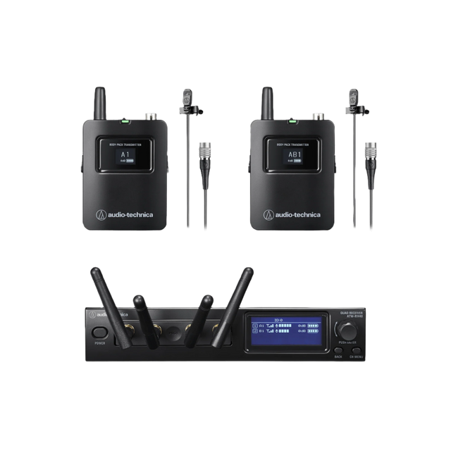 System 20 Digital Wireless System includes one ATW-R1440 4-channel receiver, two ATW-T1401 body-pack transmitters, and two MT830cW lavalier microphones.