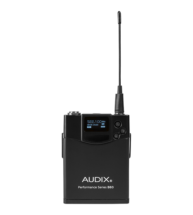 The B60 bodypack features a high-contrast LCD display with group, channel, and battery indicators. It is designed for use with all Audix lavalier, head-worn, and instrument mics, and is also excellent for guitar and bass.