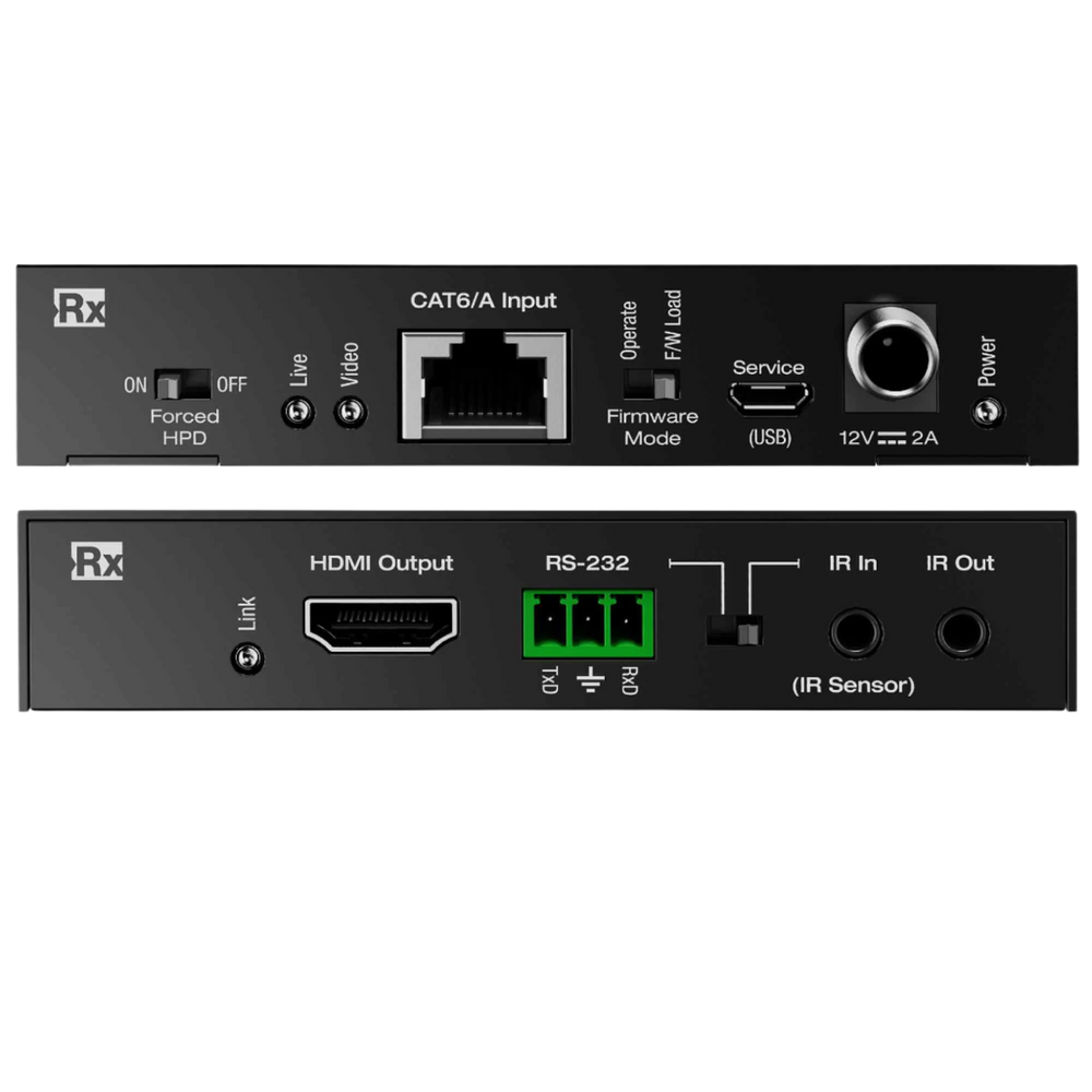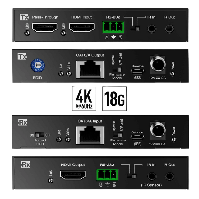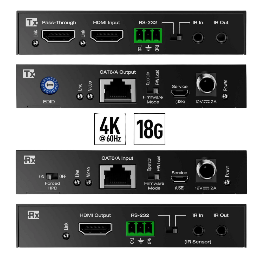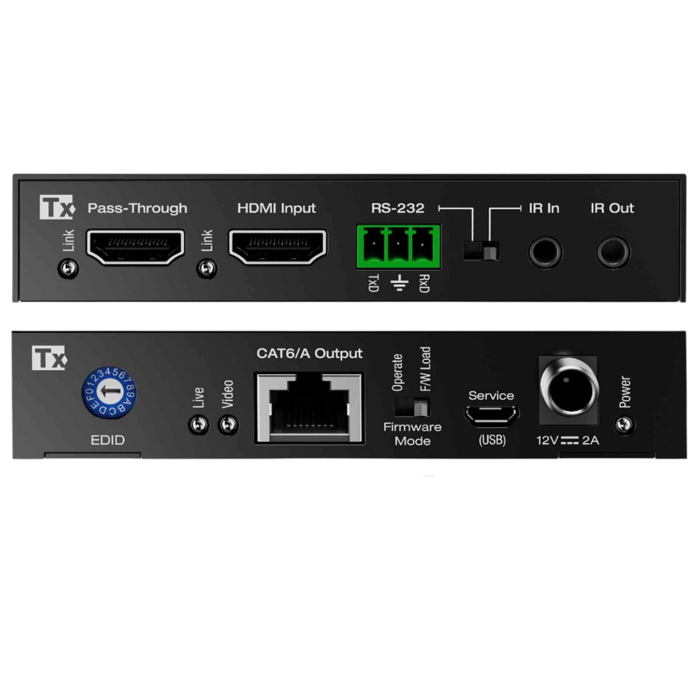 • Outputs Tx (Each): 1 CAT6/6A, 1 HDMI pass-through, 1 IR, 1 RS-232