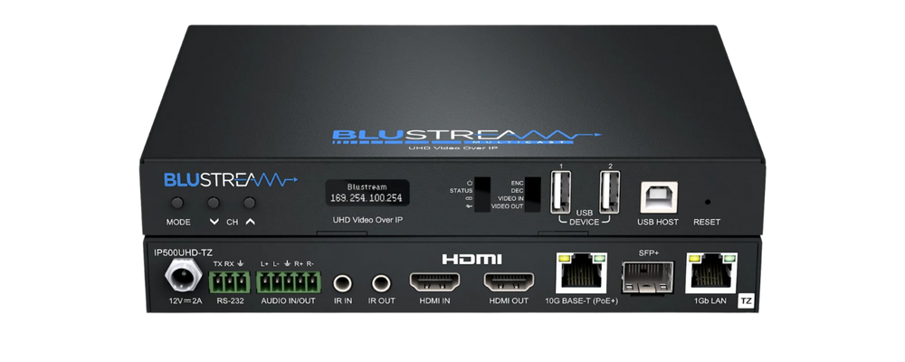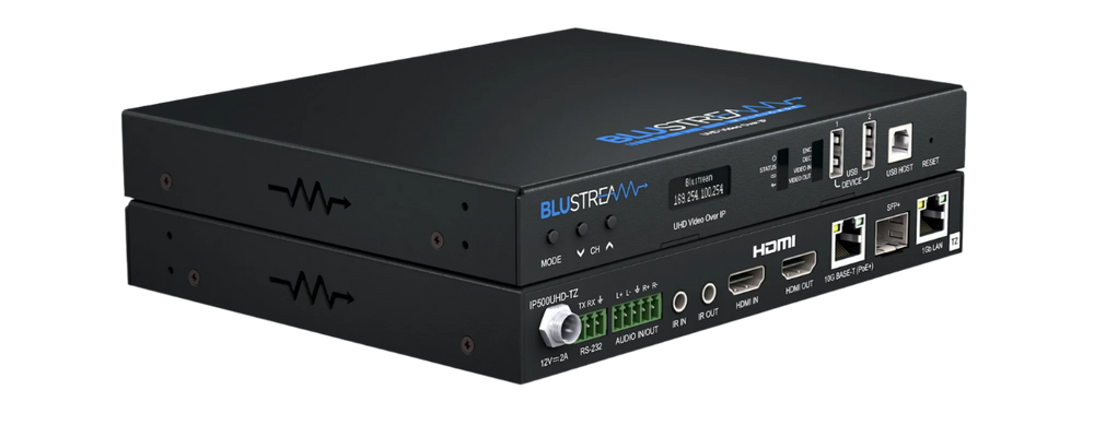 The Blustream IP500UHD Transceiver is a SDVoE AV over IP solution that provides the highest-quality, un-compromised 18Gbps 4K with zero latency Audio/Video extension over copper or optical fiber 10Gb Managed Networks.