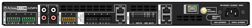 The AtlasIED AZMP4 is a 600W 4-zone audio processor with robust digital signal processing (DSP) capabilities. Compatible with all six Atmosphere wall plate accessories for control, remote audio input, and ambient noise sensing, up to 16 plug-and-play accessories can connect to the AZMP4 across 2 ports, with the option to add a zone paging station. Programming the AZMP4 is a breeze with a control interface that is device-agnostic, responsive, and ideal for user experience with custom solutions optimized for a variety of spaces. Each port supports reliable operation up to 1000ft, and in addition to Ethernet, built-in Wi-Fi allows for tablets and other controlling devices to connect directly to the AZMP4.
