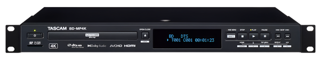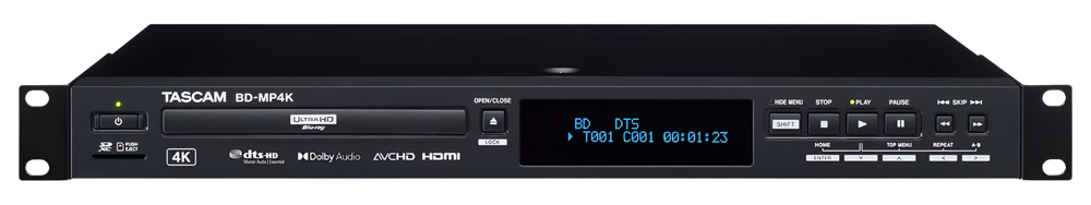 The BD-MP4K is a remote controllable 1U rack mount 4K UHD Blu-ray player with DVD/CD, SD card and USB flash memory playback. It supports a wide range of disc formats in addition to several different video, still image, and audio file formats. Featuring power on play with panel lock and hide menu functions, the BD-MP4K includes a wireless IR remote, and RS-232C and LAN ports for remote control. Professional XLR balanced audio outputs provide an optimal multi-media playback device for public/educational/commercial facilities, theaters, amusement and entertainment facilities, to name a few.