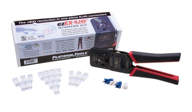 The ezEX Starter Kit gives you everything you need to start using Platinum's most advanced connector - the ezEX RJ45®. The kit includes the EXO Crimp Frame® with EX Die for perfect crimps and clean trims every time, as well as a complete assortment of ezEX connectors and strain reliefs, all at a very special price. The ezEX is the most modern RJ45 connector design that will handle the widest variety of cable sizes while offering Cat5e, Cat6 and Cat6A compatibility at speeds up to 10Gb. It is also the only one-piece connector we make that is certified for use in PoE and PoE+ applications.