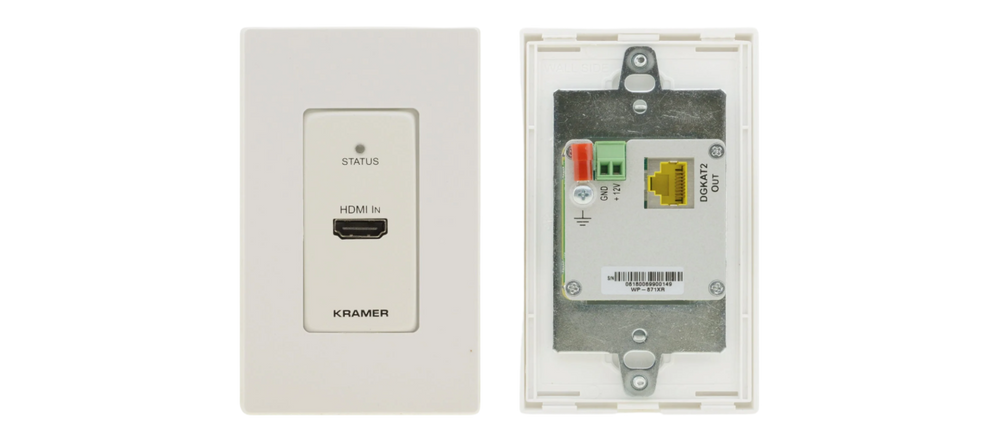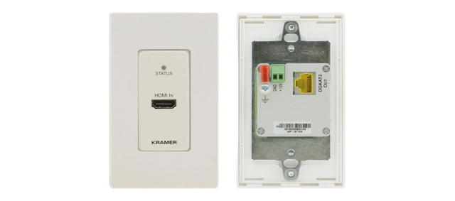 WP−871xr is a high−performance, long−reach DGKat™ 2.0 wall−plate transmitter for 4K@60Hz (4:4:4) HDR HDMI and HDCP 2.2 signals and power over twisted pair. It converts the HDMI input signal into a DGKat™ 2.0 signal and transmits it to a compatible receiver. WP−871xr extends the signal to up to 60m (200ft) at 4K@60Hz (4:4:4) resolution and up to 70m (230ft) at 4K@30Hz (4:4:4) 24bpp resolution over Kramer shielded cables. This wall−plate is powered through PoC (Power over Copper) over the twisted pair cable.