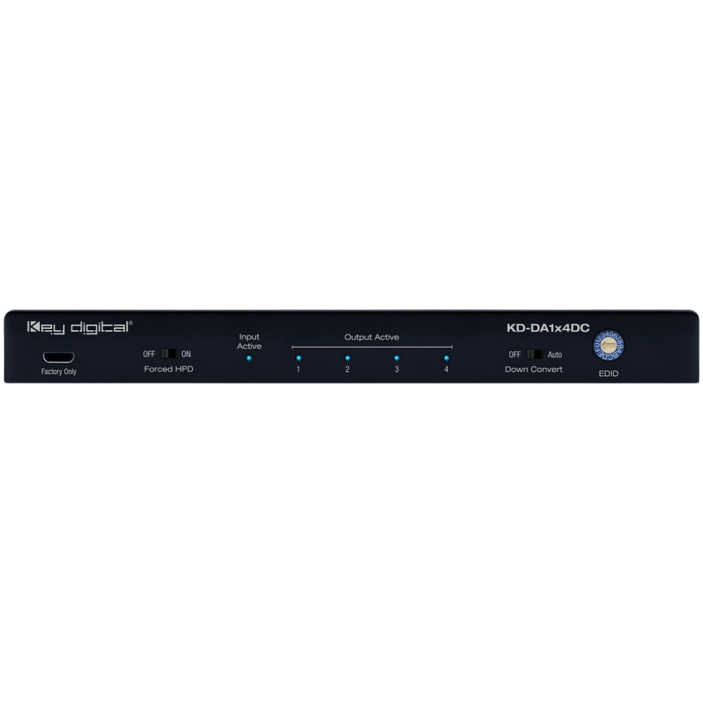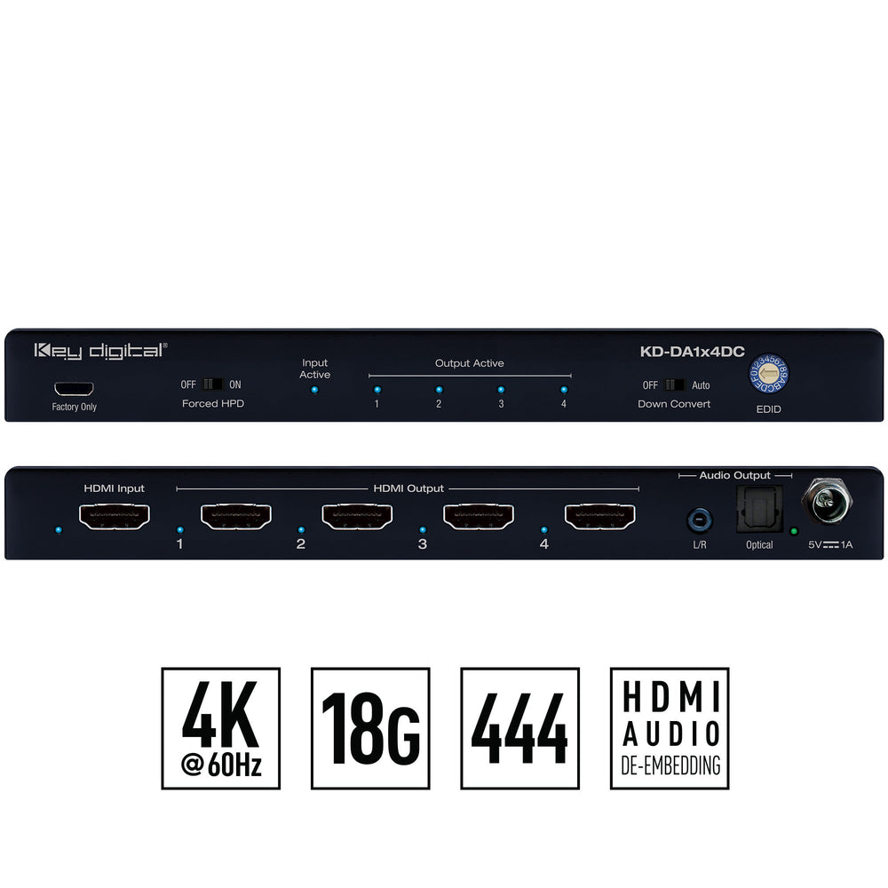 KD-DA1x4DC is a 4K 18G HDMI Distribution Amplifier with 4K to 1080p resolution down conversion option to enable a single HDMI video source to be displayed on multiple video displays, regardless of 4K or 1080p resolution support.