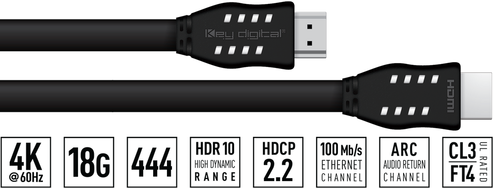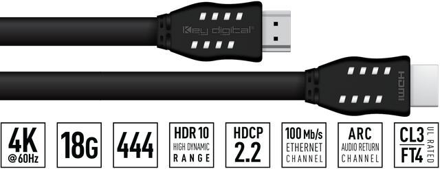 HDMI Cable with support for 4K / UHD resolutions, 18Gbps bandwidth, 4:4:4 chroma, HDR10, and HDCP2.2. CL3 and FT4 fire code rated.