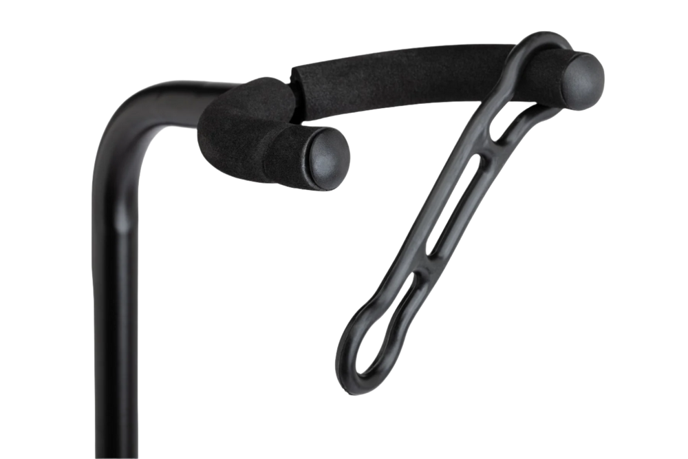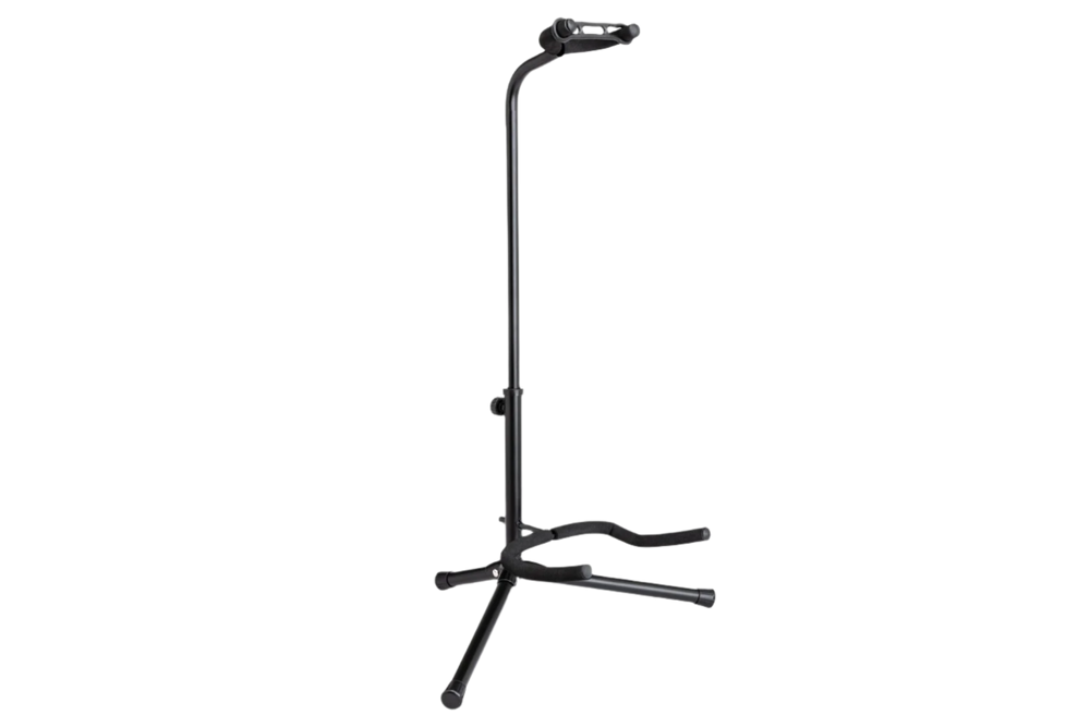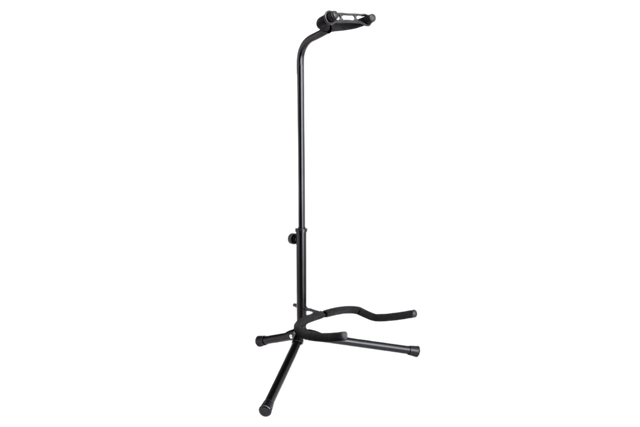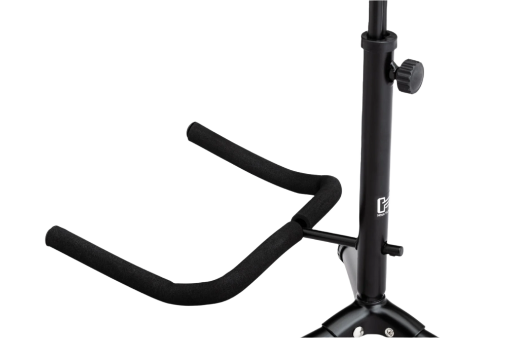 The Hosa Guitar Stand is designed to safely hold a guitar between sets or when otherwise not in use. The combination of padded neck and body supports protects the guitar’s finish and prevents neck pull. By simply turning a knob, its height can be adjusted to work with different size instruments. It is ideal for stages, practice rooms, and recording studios.