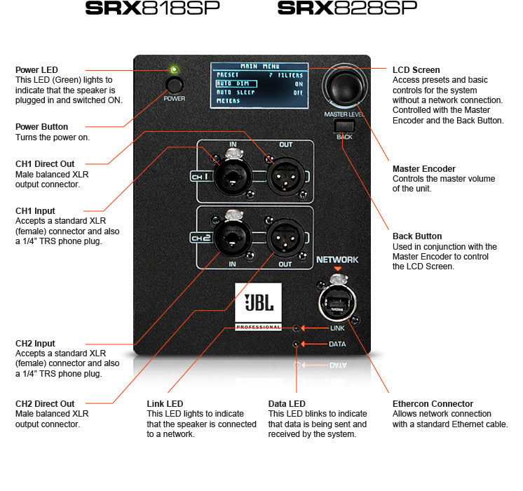 A full suite of User Controllable DSP driven by the SRX800 Series powerful onboard 400MHz Sharc DSP includes 20 PEQ’s, 2 seconds of delay, signal generators, Input mixing, amplifier monitoring, and 50 User Presets. In addition, the system can incorporate V5 JBL Tunings providing compatibility with our flagship Vertec and VTX touring systems. An integrated LCD screen supports fast setup and configuration.