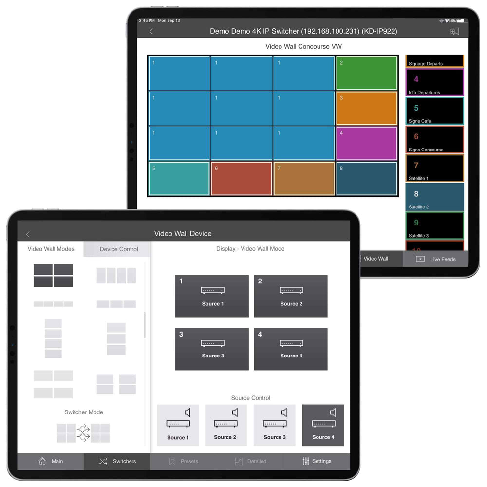 iOS app provides a programming-free user interface for controlling Key Digital app-ready devices and systems via network. KD-App scans the network to find the controllable system, and displays a pre-built UI including customized system, source and display naming, video wall control, source and displays IR control panels, and PTZ camera control depending on your Key Digital system.
