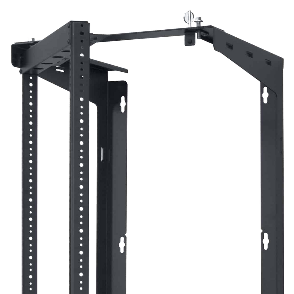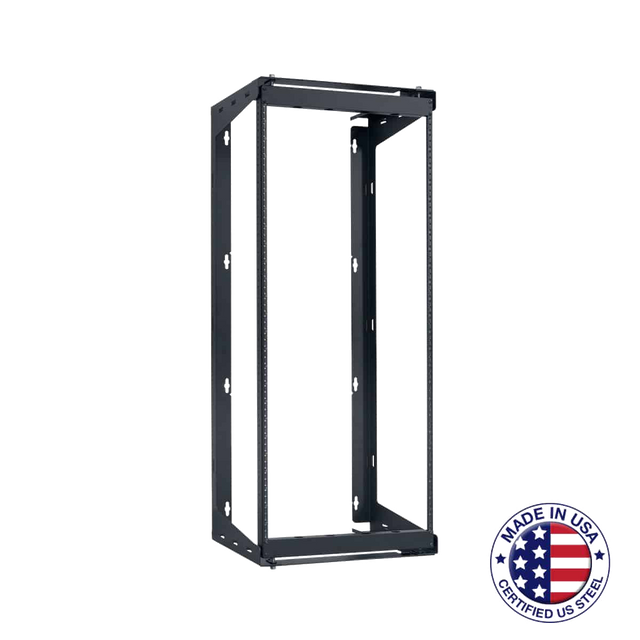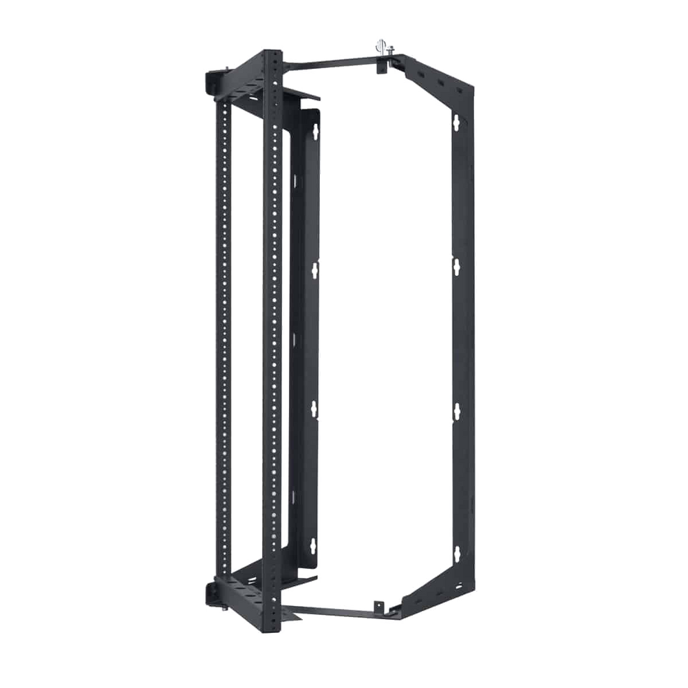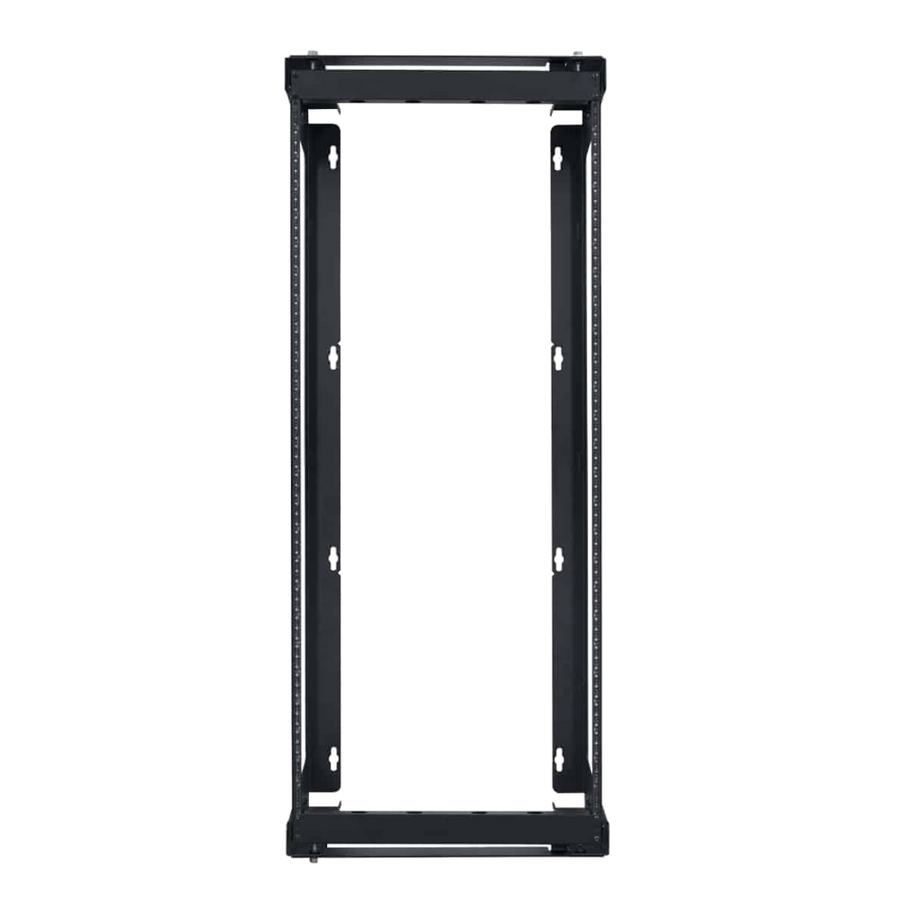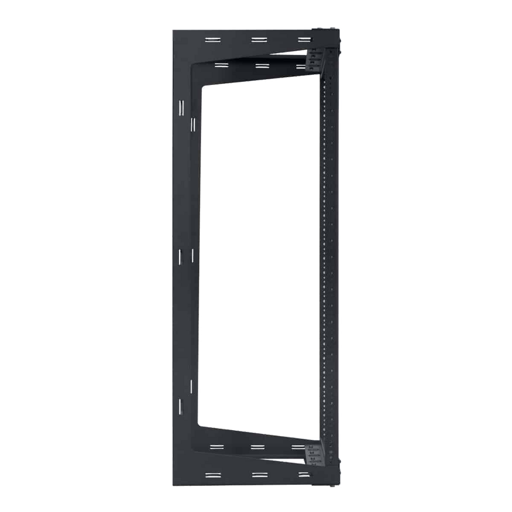 Open frame wall rack is a cost-effective solution for 19" network and security equipment kept in telecommunications rooms and similar secure areas. The versatile, swing-open frame allows easy access to equipment and cables. Steel with black powder epoxy finish.