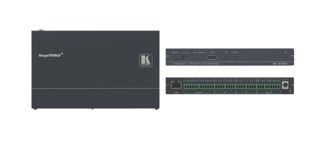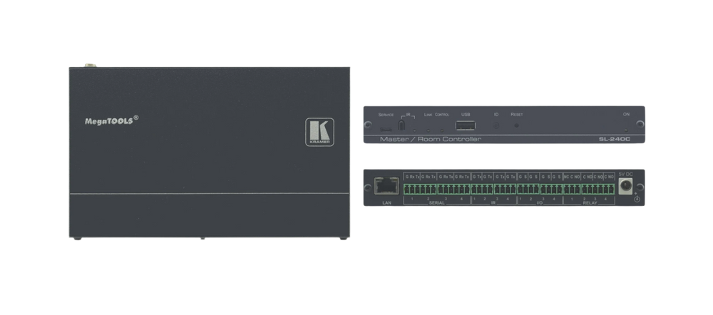 SL−240C is a compact master/space controller (Kramer Control brain) with PoE. It can operate over Ethernet with control interfaces that include: four bidirectional RS−232, four IR, four GPI/O, and four relays. It controls devices such as scalers, video displays, audio amplifiers, Blu−ray players, sensors, screens, shades, door locks, and lights. Multiple Kramer Ethernet control gateways can be used to add remote I/O ports.