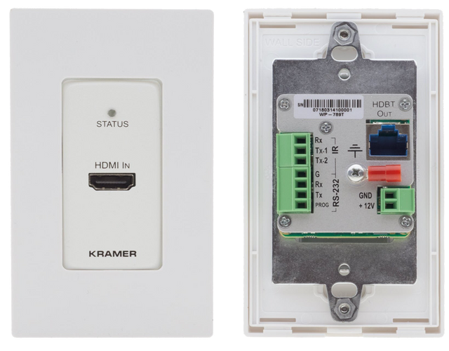 WP−789T is a high−performance, long−reach HDBaseT wall−plate transmitter for 4K@60Hz (4:2:0) HDMI and HDCP 2.2 signals over twisted pair. It converts the HDMI input signal into an HDBaseT signal and transmits it to a compatible receiver. It extends video signals to up to 40m (130ft) over Kramer copper cables at up to 4K@60Hz (4:2:0) 24bpp video resolution and provides even further reach for lower HD video resolutions. This wall−plate is powered through PoE (Power over Ethernet) over the twisted pair cable.