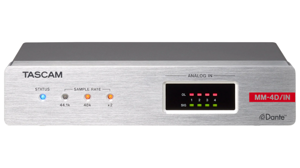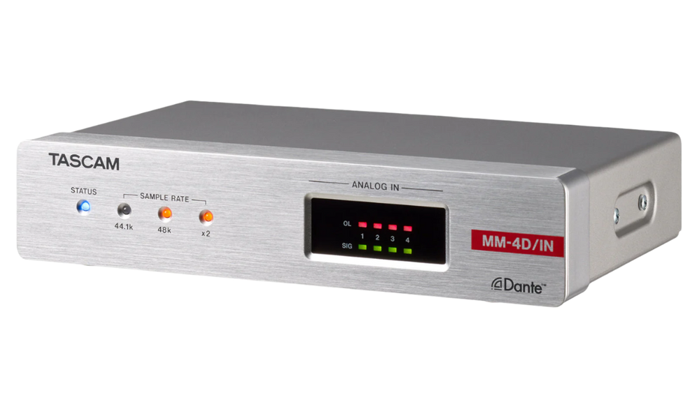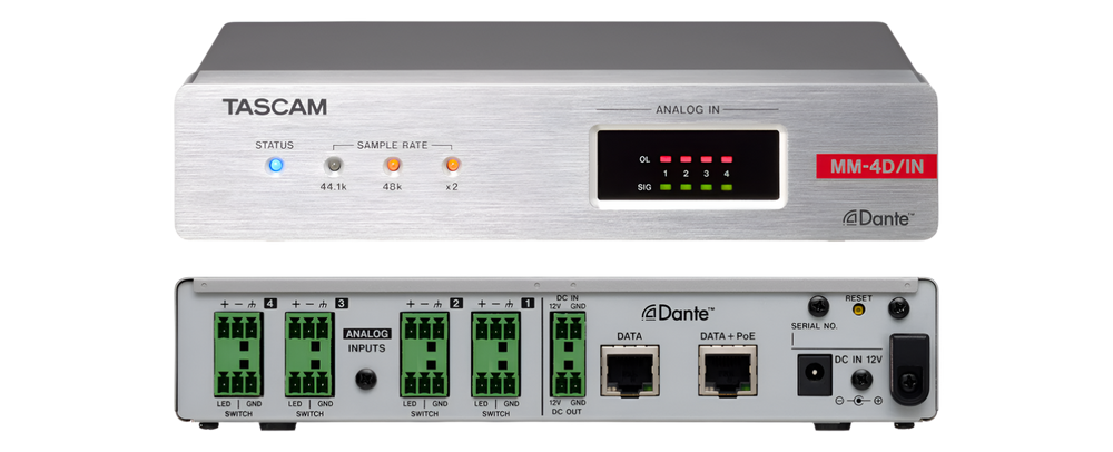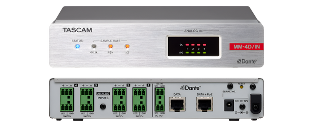 The MM-4D/IN-E is a compact converter that converts 4-channel mic/line input signals into Dante signals. With half the size of a standard 1U rack, the MM-4D/IN-E is suitable for different Dante systems as an exquisite analog output unit. The built-in DSP mixer enables small scale systems to fully perform with a variety of input/output models the TASCAM Dante Compact Processor Series offers. MM-4D/IN-E supports up to 96kHz/24bit and uses Euroblock connectors for analog mic/line input.