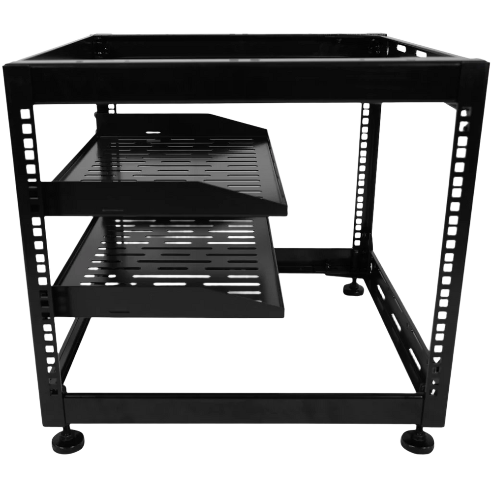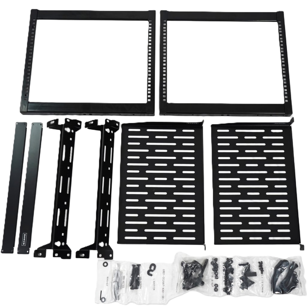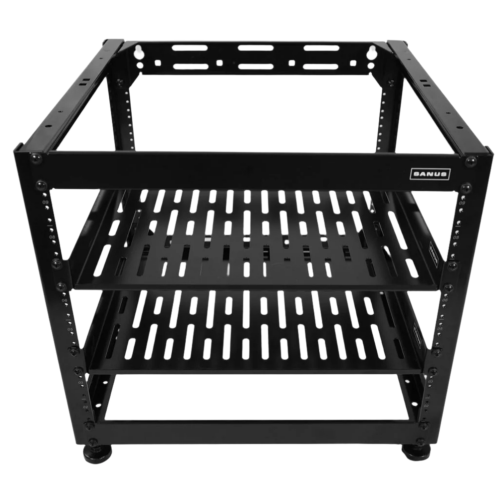 The open frame rack design includes 2 fully vented 1U shelves to provide air circulation and provide cooling for high end networking equipment and AV components. Easily stack this modular rack with the other knockdown SANUS skeleton racks that come in 15U and 20U heights to create your own customized solution.