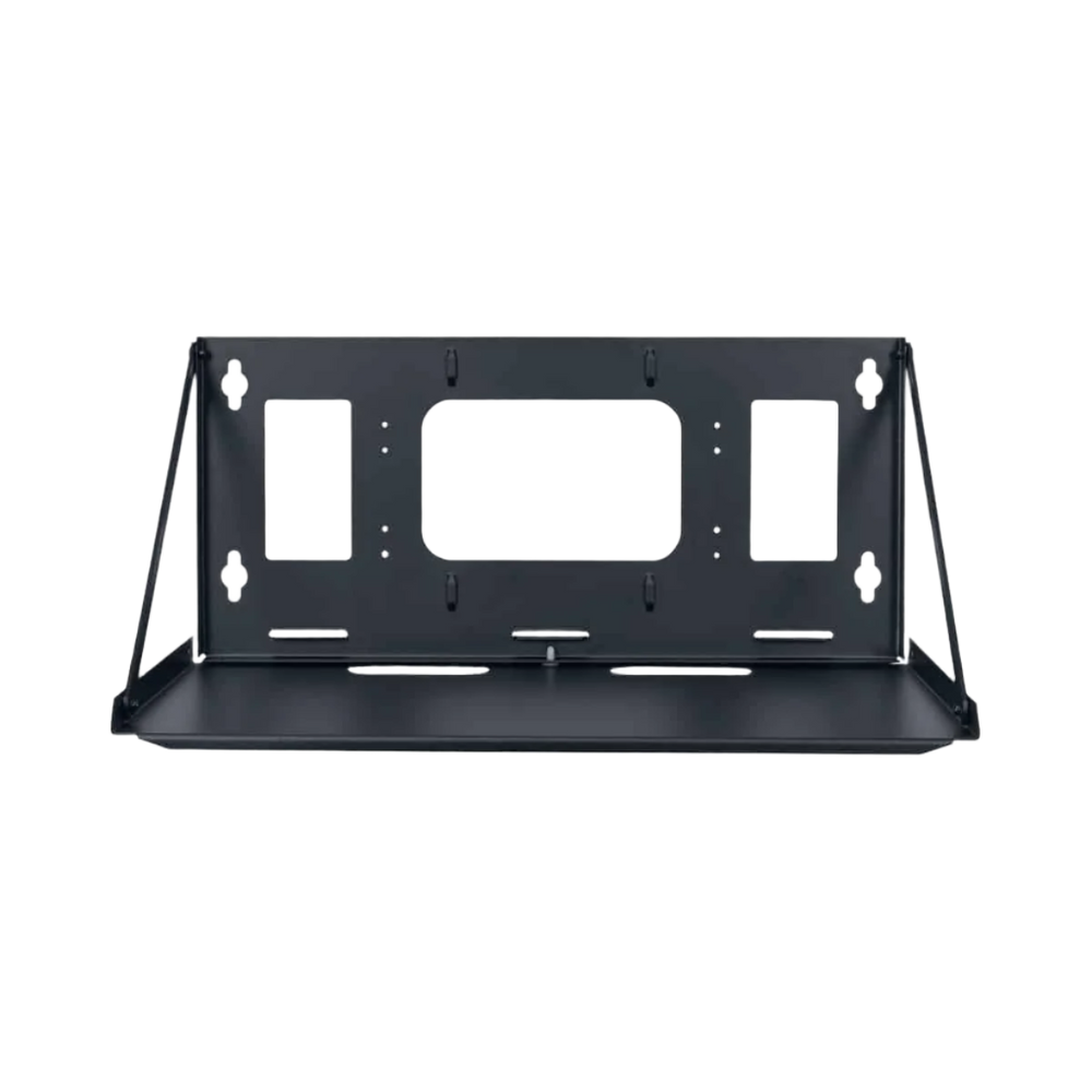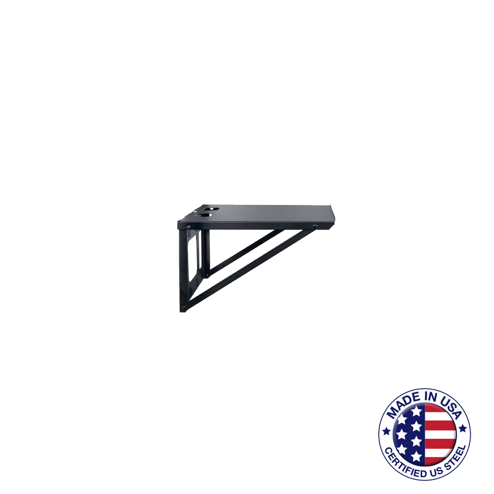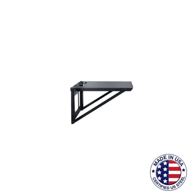 Steel wall shelf ships flat for efficient shipping and warehousing and unfolds to the service position for quick installation with flanges that insert into rear panel cutouts. Mounts with equipment platform up or down. Keyhole mounting slots on 16-inch centers. Steel with black powder epoxy finish.