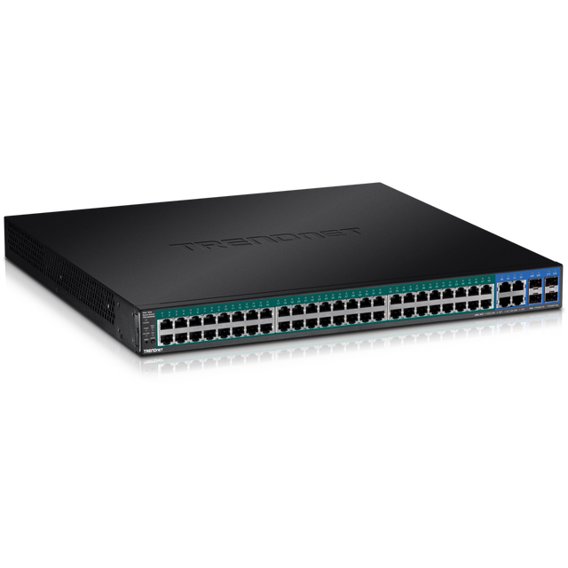 TRENDnet's 52-Port Gigabit Web Smart PoE+ Switch, model TPE-5048WS, delivers advanced management features with a 104Gbps switching capacity. This rack mountable IPv6 ready switch comes with an intuitive web-based interface. Advanced traffic management controls, troubleshooting, and SNMP monitoring make this a powerful solution for SMB networks. The TPE-5048WS provides 48 gigabit PoE+ ports with a total power budget of 740W, and four shared gigabit ports (RJ-45 or SFP). The PoE+ standard supplies up to 30W of power per port for devices such as high-power wireless access points, PTZ (Pan Tilt Zoom) Internet cameras, and VoIP telephony systems.