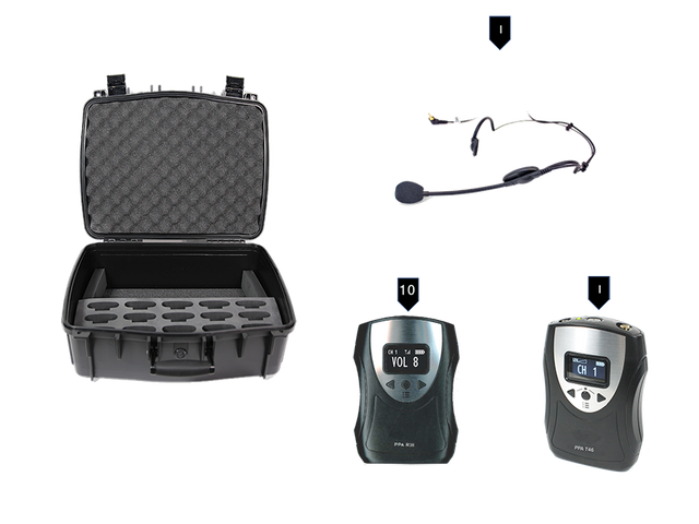 Includes: (1) PPA T46 FM Transmitter, (10) PPA R38N FM Receivers - It does not come with any earphones, headphones or neckloops.