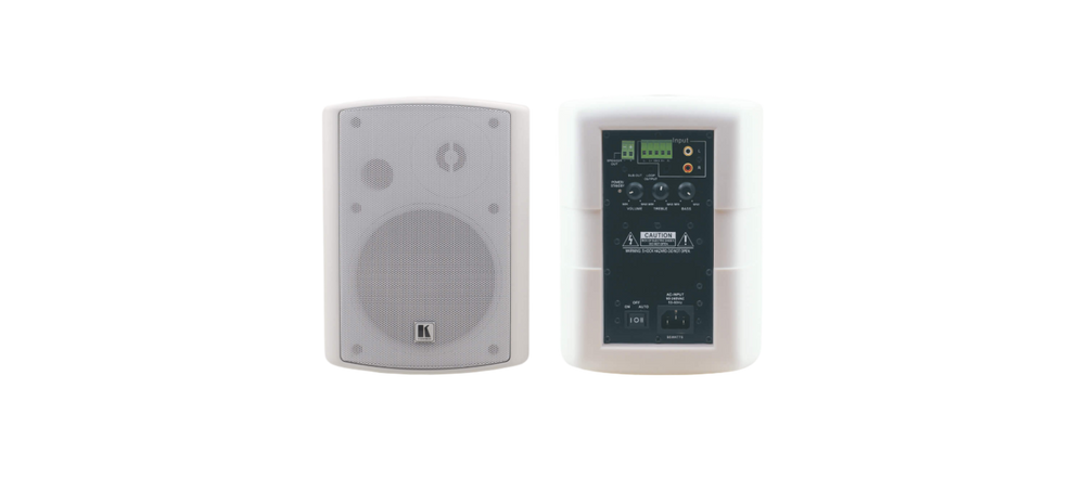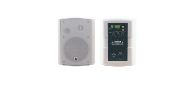The Tavor 5−O is a pair of 5.25" powered two−way speakers designed for indoor wall mounting. The active speaker accepts a line−level stereo input and amplifies it using a built−in amplifier and outputs a speaker signal to the passive speaker.